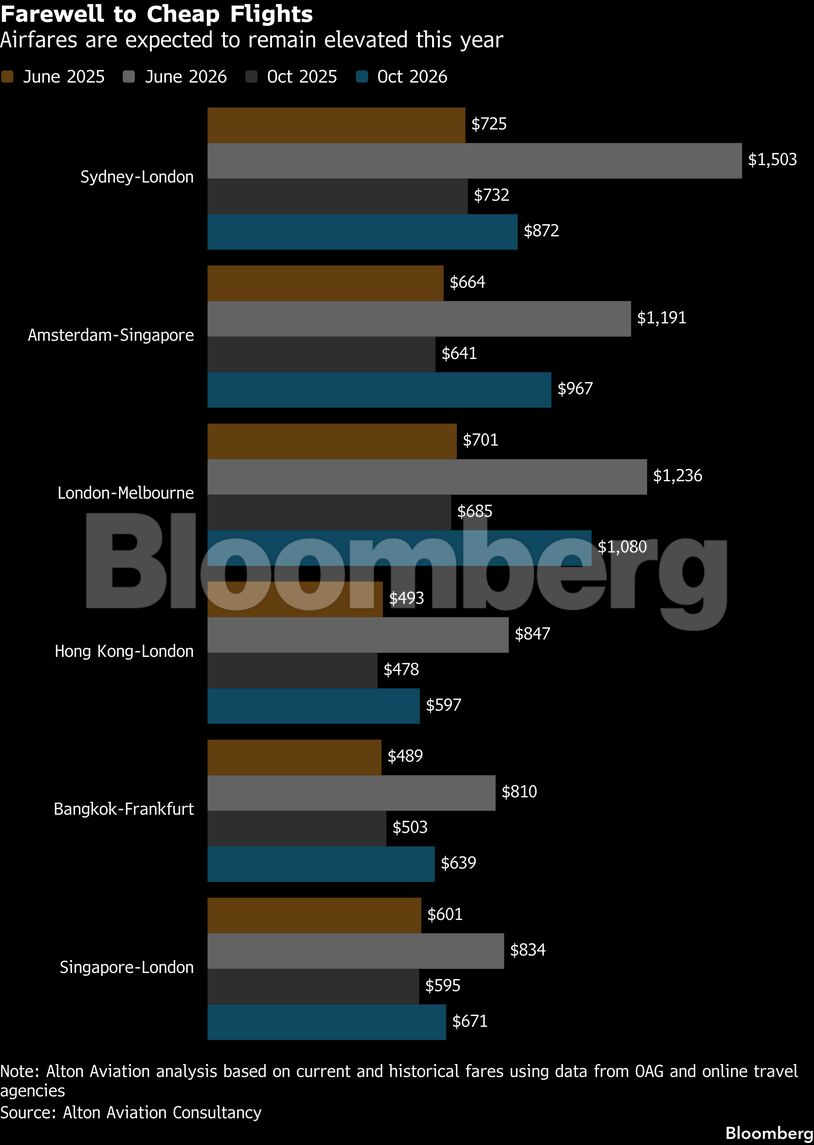 Σύμφωνα με ανάλυση της Alton Aviation Consultancy, που βασίζεται σε στοιχεία της Cirium και διαδικτυακών ταξιδιωτικών πρακτορείων, οι τιμές για ταξίδια τον Ιούνιο σε επτά δημοφιλείς διαδρομές Ασίας-Ευρώπης είναι κατά μέσο όρο αυξημένες κατά περίπου 70% σε σύγκριση με πέρυσι. Ενδεικτικά, ένα εισιτήριο από το Σίδνεϊ προς το Λονδίνο ξεπερνά πλέον τα 1.500 δολάρια, περίπου διπλάσιο σε σχέση με το 2025. Στις τιμές περιλαμβάνονται τόσο απευθείας όσο και πτήσεις με μία στάση, καθώς και δρομολόγια μέσω αεροδρομίων του Κόλπου.