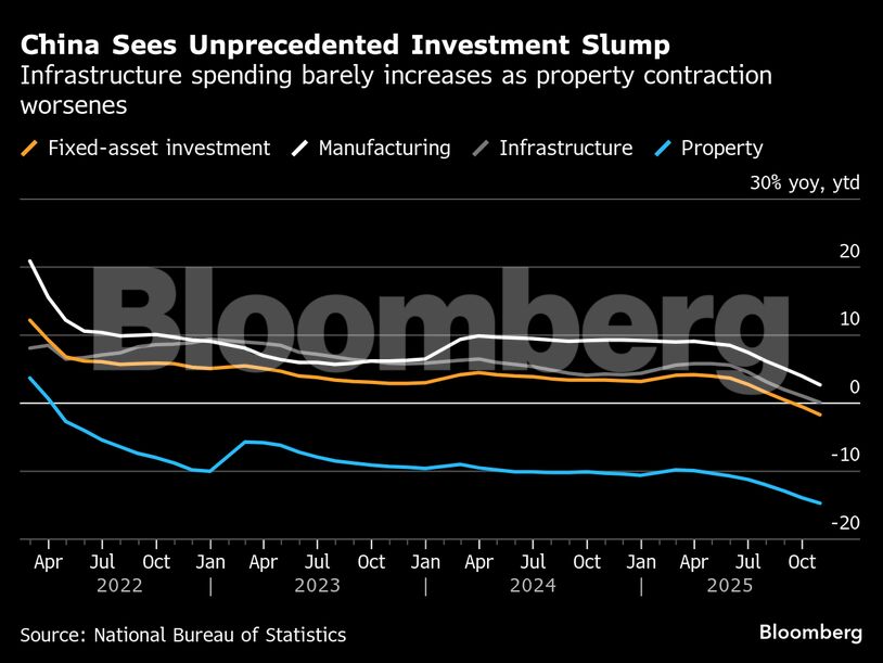 Η οικονομική δραστηριότητα της Κίνας επιβραδύνθηκε περισσότερο από το αναμενόμενο στην αρχή του τέταρτου τριμήνου, με μια άνευ προηγουμένου πτώση των επενδύσεων και επιβράδυνση της ανάπτυξης της βιομηχανικής παραγωγής να προστίθενται στην επιβράδυνση της κατανάλωσης.