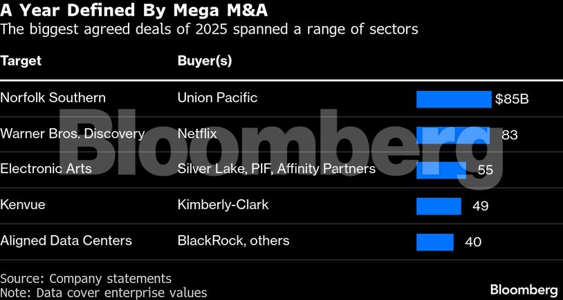 Πέρα από την εξαγορά της Warner Bros. από τη Netflix, στα blockbusters του 2025 περιλαμβάνονται η απόκτηση της Norfolk Southern Corp. από την Union Pacific Corp. έναντι άνω των 80 δισ. δολαρίων (μαζί με χρέος), το ρεκόρ leveraged buyout της Electronic Arts Inc. και η εξαγορά της Teck Resources Ltd. από την Anglo American Plc, που αναδιαμορφώνει τον παγκόσμιο μεταλλευτικό χάρτη.