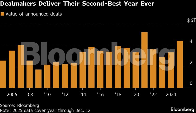 Η συνολική αξία των παγκόσμιων συναλλαγών αυξήθηκε περίπου 40% φέτος, στα 4,5 τρισ. δολάρια, σύμφωνα με στοιχεία του Bloomberg, καθώς οι εταιρείες κυνηγούν εξαιρετικά φιλόδοξους συνδυασμούς, ενθαρρυμένες από πιο φιλικούς ρυθμιστές. Πρόκειται για τη δεύτερη υψηλότερη επίδοση που έχει καταγραφεί ποτέ και περιλαμβάνει τον μεγαλύτερο αριθμό συμφωνιών αξίας άνω των 30 δισ. δολαρίων.