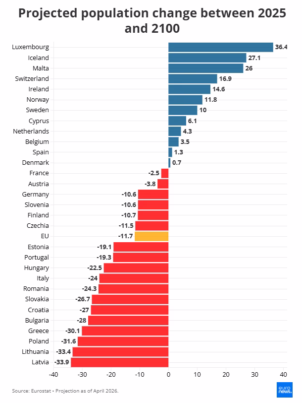 Σύμφωνα με τις τελευταίες προβλέψεις της Eurostat, ο πληθυσμός της Ευρωπαϊκής Ένωσης αναμένεται να μειωθεί κατά περίπου 11,7% μεταξύ 2025 και 2100. Αυτό σημαίνει ότι από τα 452 εκατομμύρια κατοίκους σήμερα, η ΕΕ θα φτάσει περίπου τα 399 εκατομμύρια στο τέλος του αιώνα.