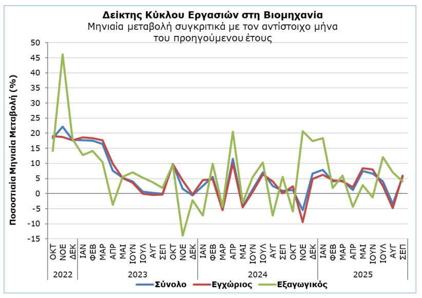 Κατά τον μήνα Σεπτέμβριο 2025, ο Δείκτης Κύκλου Εργασιών στη Βιομηχανία έφθασε τις 151,8 μονάδες (βάση 2021=100), σημειώνοντας αύξηση 5,6% σε σύγκριση με τον Σεπτέμβριο του 2024. Για την περίοδο Ιανουαρίου – Σεπτεμβρίου 2025, ο δείκτης παρουσίασε αύξηση 4,2% σε σύγκριση με την αντίστοιχη περίοδο του προηγούμενου έτους.