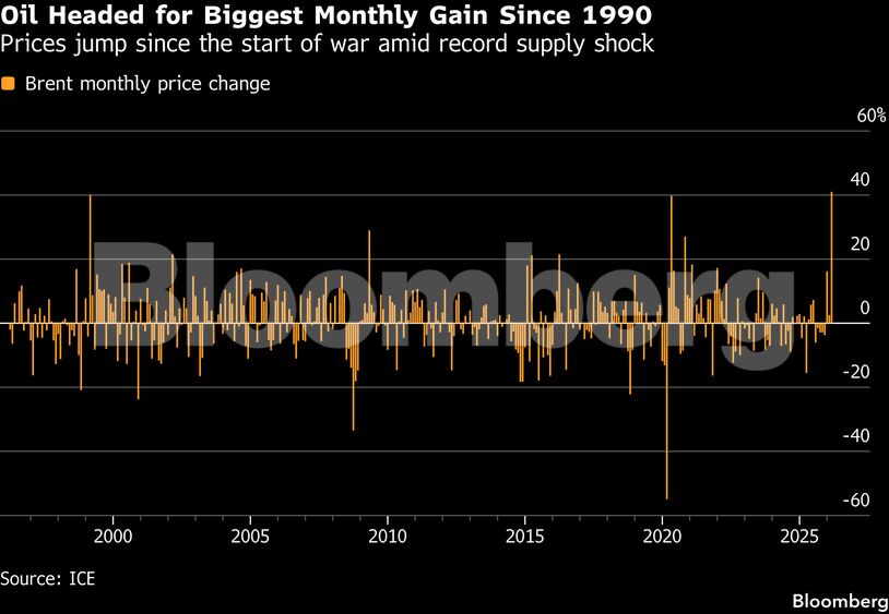 Σε μηνιαία βάση, οι τιμές οδεύουν προς τη μεγαλύτερη άνοδο από το 1990, αντανακλώντας το σοκ προσφοράς που έχει προκαλέσει η σύγκρουση στη Μέση Ανατολή.