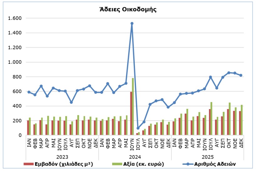 Κατά την περίοδο Ιανουαρίου – Δεκεμβρίου 2025, εκδόθηκαν 8.159 άδειες οικοδομής σε σύγκριση με 6.827 την αντίστοιχη περίοδο του προηγούμενου έτους, σημειώνοντας αύξηση 19,5%. Η συνολική αξία των αδειών αυτών αυξήθηκε κατά 37,8% και το συνολικό εμβαδόν κατά 41,0%. Ο αριθμός των οικιστικών μονάδων παρουσίασε αύξηση της τάξης του 42,7%.