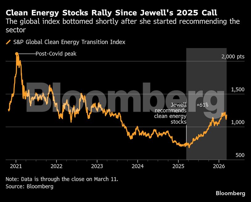 Ένα χρόνο αργότερα, ο δείκτης S&P Global Clean Energy Transition Index έχει σημειώσει άνοδο 61%, ξεπερνώντας κατά πολύ την άνοδο 23% του δείκτη S&P 500. Είναι επίσης καλύτερη από την άνοδο 39% των «Magnificent Seven» και σχεδόν διπλάσια από το κέρδος των μετοχών πετρελαίου, ακόμη και καθώς αυτό ξεπερνά συχνά-πυκνά τα 100 δολάρια το βαρέλι εν μέσω του πολέμου στο Ιράν.