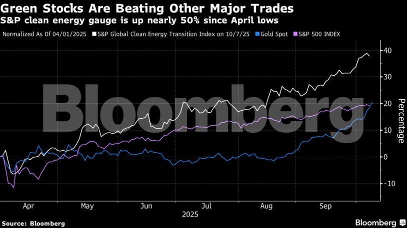 Ο δείκτης S&P Global Clean Energy Transition Index έχει σημειώσει άνοδο σχεδόν 50% από τότε που οι ανακοινώσεις του Ντόναλντ Τραμπ τον Απρίλιο σχετικά με τους δασμούς προκάλεσαν αναταραχή στις αγορές. Αυτό συγκρίνεται με την άνοδο περίπου 35% που σημείωσαν τόσο ο δείκτης S&P 500 όσο και ο χρυσός κατά την ίδια περίοδο.