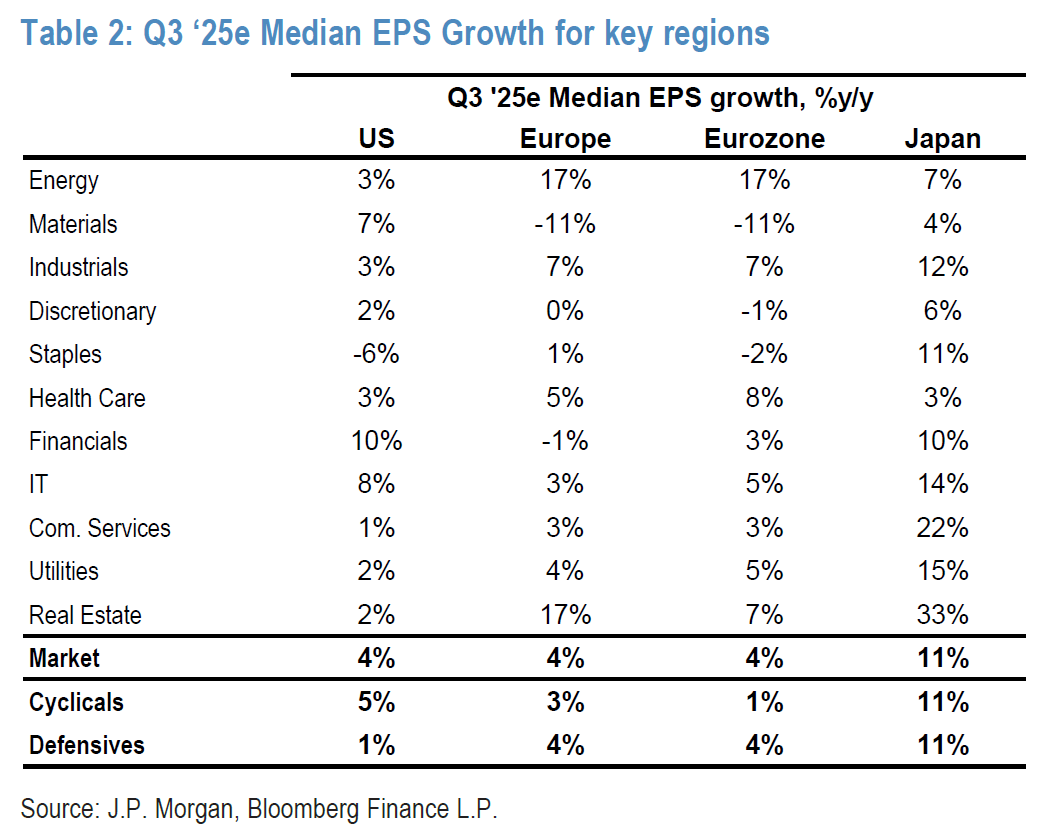 Στην έκθεση «Equity Strategy – Q3 Preview», ο οίκος επισημαίνει ότι το γ΄ τρίμηνο αναμένεται να καταγράψει ελαφρώς αρνητική μεταβολή κερδών (-1%) για τον Stoxx 600, έναντι +6% για τον S&P 500, όμως τα μηνύματα από τους PMI δείκτες και τον credit impulse δείχνουν σταδιακή σταθεροποίηση της δραστηριότητας στην Ευρώπη. Η τάση αυτή, σύμφωνα με την J.P. Morgan, προετοιμάζει το έδαφος για ανάκαμψη κερδών ~+15% το 2026, στηριζόμενη σε πιο ήπιο ενεργειακό περιβάλλον, χαμηλότερα επιτόκια και δημοσιονομική στήριξη στη Γερμανία και τη Γαλλία.