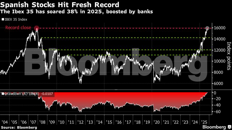 Ο δείκτης IBEX 35 σημείωσε άνοδο έως 0,6%, αγγίζοντας τις 15.948 μονάδες τη Δευτέρα, επίπεδο που υπερβαίνει το προηγούμενο ρεκόρ, πριν από την παγκόσμια χρηματοπιστωτική κρίση του 2008.