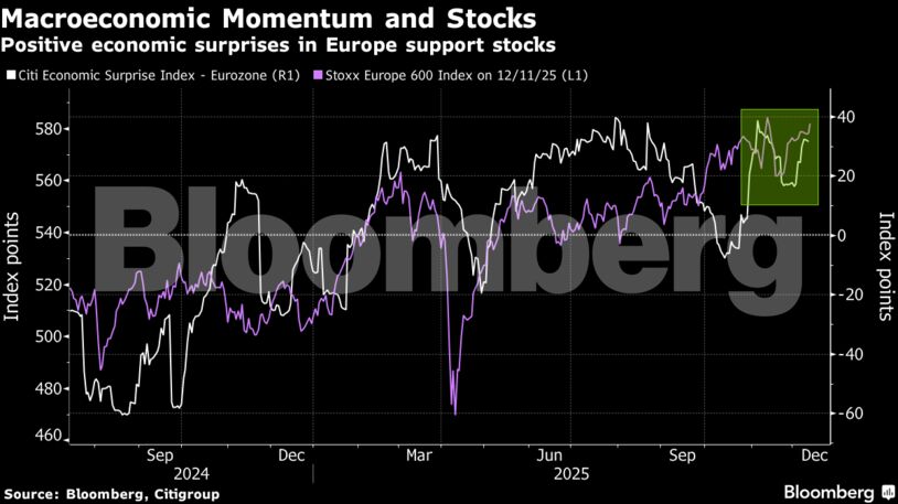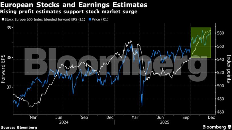 Οι μετοχές της περιοχής είχαν μια ισχυρή πορεία το 2025, με τον Stoxx 600 να σημειώνει άνοδο 15% και να βρίσκεται σε τροχιά για τρίτη συνεχόμενη χρονιά κερδών. Οι μετοχές επωφελήθηκαν από το ενδιαφέρον των επενδυτών που αναζητούσαν διαφοροποίηση εκτός των ΗΠΑ, προσελκύοντας χαμηλότερες αποτιμήσεις, πιο διαλλακτική νομισματική πολιτική και την υπόσχεση αυξημένων κρατικών δαπανών.