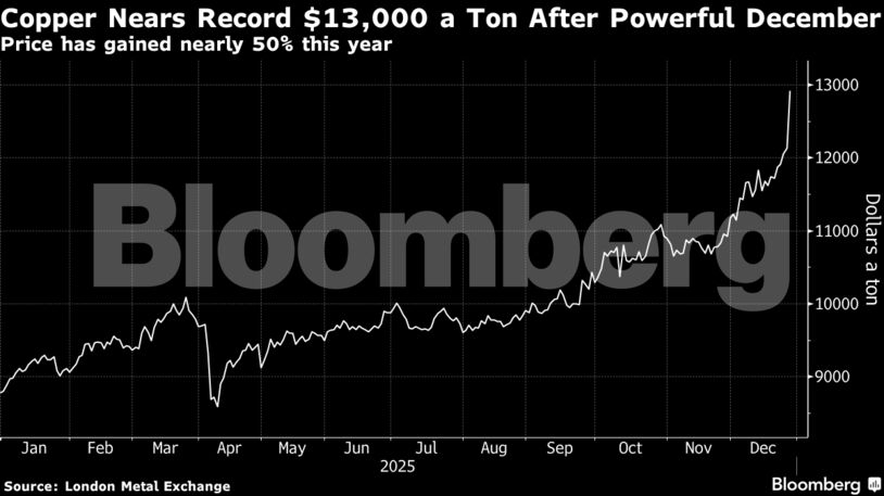 Ο χαλκός εκτινάχθηκε κοντά στο ιστορικό ορόσημο των 13.000 δολαρίων ο τόνος στο χρηματιστήριο μετάλλων του Λονδίνου, ολοκληρώνοντας με εντυπωσιακό ράλι το τέλος της χρονιάς, καθώς εντείνονται οι ανησυχίες για περιορισμένη προσφορά.