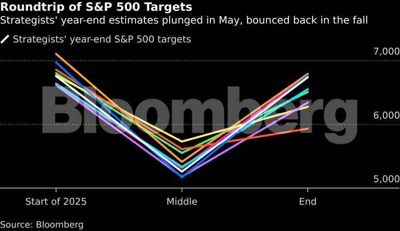 Η πρόβλεψη του πού θα καταλήξει η αμερικανική αγορά κάθε χρόνο αποτελεί πρόκληση. Αλλά το 2025 ήταν ακόμη δυσκολότερη. Σχεδόν όλες οι μεγάλες τράπεζες της Wall Street μείωσαν τις προβλέψεις τους για τον S&P 500 ως αντίδραση στο εκτεταμένο πρόγραμμα δασμών της κυβέρνησης Τραμπ. Στη συνέχεια, όλες έπρεπε να αναθεωρήσουν προς τα πάνω τους στόχους τους, καθώς η πολιτική χαλάρωσε, οι προσδοκίες για τα εταιρικά κέρδη ανέκαμψαν και οι τιμές των μετοχών εκτοξεύτηκαν.