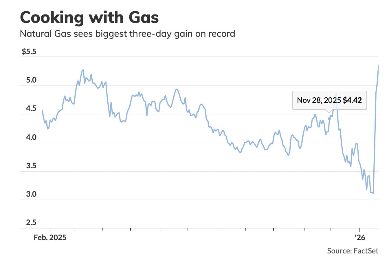 Τα συμβόλαια μελλοντικής εκπλήρωσης για παράδοση τον Φεβρουάριο εκτινάχθηκαν κατά 62,6% μέσα σε μόλις τρεις συνεδριάσεις, φτάνοντας τα 5,05 δολάρια ανά εκατομμύριο BTU — τη μεγαλύτερη τριήμερη ποσοστιαία άνοδο που έχει καταγραφεί ποτέ.