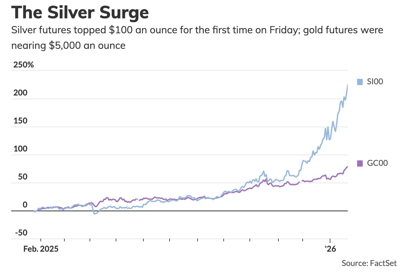 Η αναταραχή στις αγορές και οι φόβοι για γεωπολιτικές και νομισματικές εξελίξεις ώθησαν τα πολύτιμα μέταλλα σε πρωτοφανή επίπεδα. Τα συμβόλαια ασημιού ξεπέρασαν για πρώτη φορά στην ιστορία τα 100 δολάρια ανά ουγγιά, ενώ ο χρυσός πλησίασε επικίνδυνα το ορόσημο των 5.000 δολαρίων.
