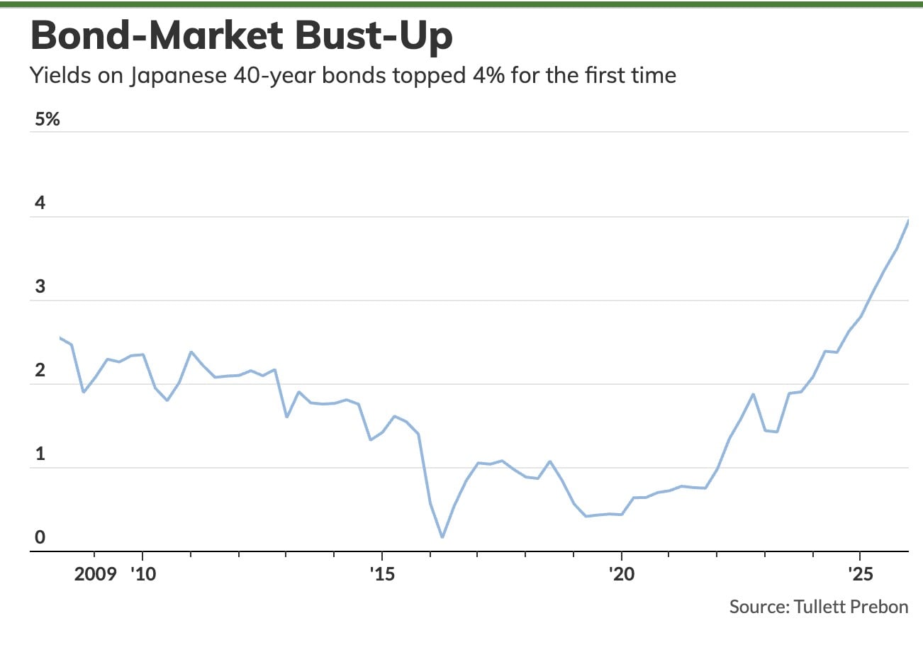 Η απόδοση του 40ετούς ιαπωνικού ομολόγου ξεπέρασε το 4% για πρώτη φορά, καταγράφοντας τη μεγαλύτερη ημερήσια άνοδο από το 2009.
