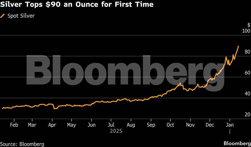 Το ασήμι ξεπέρασε για πρώτη φορά τα 90 δολάρια ανά ουγγιά, ενώ ο χρυσός πλησίασε σε ιστορικό υψηλό, καθώς οι επιθέσεις κατά της Ομοσπονδιακής Τράπεζας των ΗΠΑ, η προοπτική περαιτέρω μειώσεων επιτοκίων και ένα τεταμένο γεωπολιτικό περιβάλλον έδωσαν νέα ώθηση σε ένα εκρηκτικό ράλι στα πολύτιμα μέταλλα.