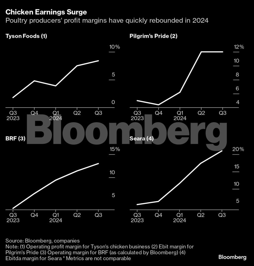 Ο κόσμος καταναλώνει περισσότερο κοτόπουλο και αυτό συμβάλλει στην ενίσχυση των κερδών των παραγωγών πουλερικών. Ο τελευταίος γύρος τριμηνιαίων αποτελεσμάτων από εταιρείες όπως η Tyson Foods Inc. και οι βραζιλιάνικοι κολοσσοί BRF SA και JBS SA έδειξαν περιθώρια κέρδους σε σημαντικά υψηλότερα επίπεδα από ό,τι πριν από ένα χρόνο.