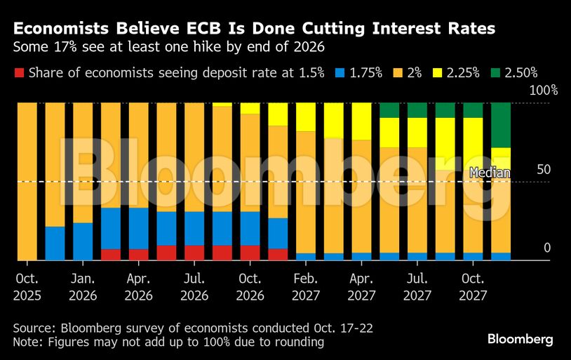Η Ευρωπαϊκή Κεντρική Τράπεζα θα διατηρήσει το κόστος δανεισμού στην ευρωζώνη στο 2% έως το 2027, σύμφωνα με δημοσκόπηση του Bloomberg μεταξύ οικονομολόγων.
