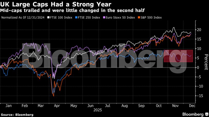 Μετά την ισχυρότερη επίδοση του FTSE 100 εδώ και 16 χρόνια, οι βρετανικές μετοχές φαίνεται ότι θα συνεχίσουν να κινούνται υποτονικά για ακόμη μία περίοδο, καθώς το οικονομικό περιβάλλον παραμένει δυσμενές. Ο δείκτης των blue chips του Ηνωμένου Βασιλείου έχει διαψεύσει τις προσδοκίες μέσα στο 2025, καταγράφοντας άνοδο 19% και υπεραποδίδοντας έναντι του S&P 500 και του Euro Stoxx 50. Ωστόσο, οι εγχώριες μετοχές έχουν μείνει πίσω. Ο FTSE 250 ενισχύεται μόλις κατά 6,5%, καθώς τα υψηλά επιτόκια, η υποτονική οικονομία και η αυξανόμενη φορολογική επιβάρυνση επιβαρύνουν το επενδυτικό κλίμα.