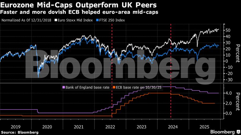 Αντίθετα, οι μεσαίας κεφαλαιοποίησης μετοχές της ευρωζώνης ξεχωρίζουν ως οι μεγάλοι κερδισμένοι, καταγράφοντας άνοδο 17%, χάρη στη πιο ήπια νομισματική πολιτική και τις δεσμεύσεις για κρατικές δαπάνες. Οι εκτιμήσεις για την αύξηση των κερδών την επόμενη χρονιά δεν είναι ιδιαίτερα ενθαρρυντικές ούτε για τον FTSE 250, καθώς περιορίζονται στο 7,5%, έναντι 27% για τον Euro Stoxx Mid-Cap, σύμφωνα με στοιχεία που συγκέντρωσε το Bloomberg. Οι προβλέψεις είναι υψηλότερες και για τους περισσότερους δείκτες μεγάλης κεφαλαιοποίησης, οι οποίοι αναμένεται να εμφανίσουν αύξηση κερδών κοντά ή και πάνω από διψήφια ποσοστά το 2026.