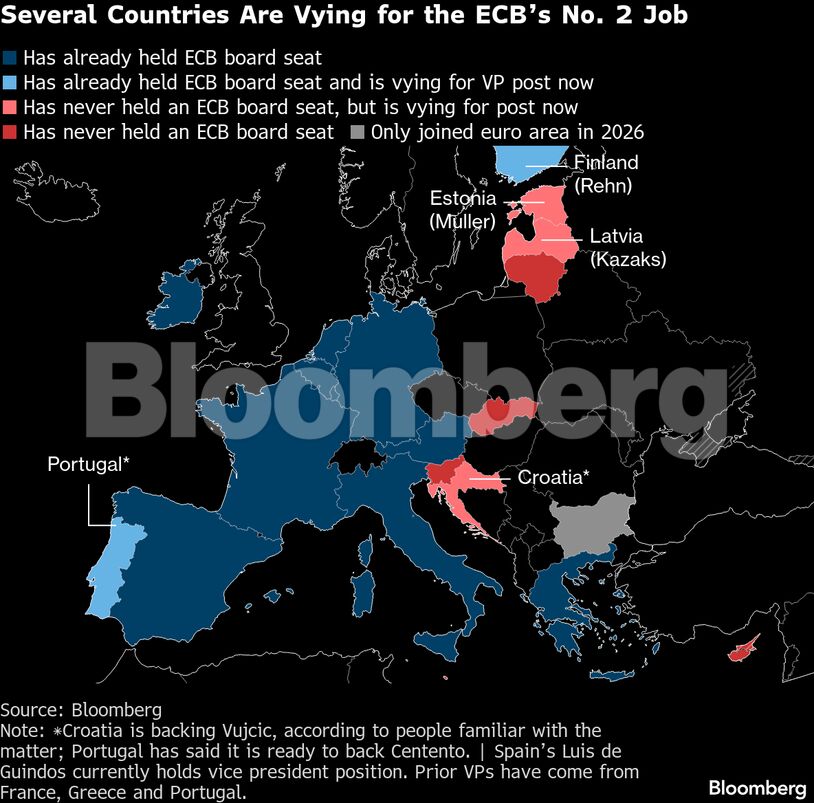 Υποψήφιοι από την Εσθονία, τη Λετονία και την Κροατία διεκδικούν τη θέση του αντιπροέδρου Ντε Γκίντος, ο οποίος αποχωρεί τον Μάιο. Ακόμη και αν δεν επιτύχουν, μέχρι το τέλος του 2027 θα υπάρχουν άλλες τρεις κενές θέσεις στο εξαμελές Εκτελεστικό Συμβούλιο.