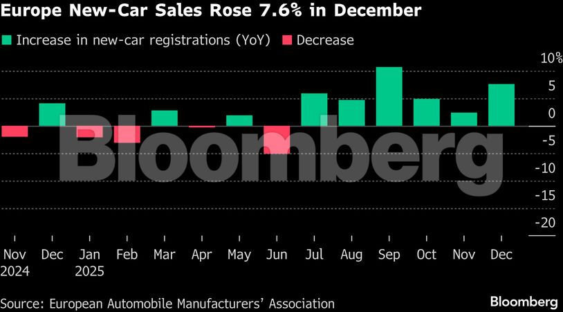 Οι ταξινομήσεις νέων οχημάτων ενισχύθηκαν κατά 2,4%, φτάνοντας τα 13,3 εκατ. οχήματα, μετά από νέα άνοδο τον Δεκέμβριο, σύμφωνα με την Ευρωπαϊκή Ένωση Κατασκευαστών Αυτοκινήτων. Παρ’ όλα αυτά, οι συνολικές πωλήσεις παραμένουν περίπου 15% χαμηλότερα από τα επίπεδα πριν από την πανδημία, παρά τη σταδιακή ανάκαμψη ενός κλάδου που δοκιμάστηκε από δασμούς και αυξανόμενο ανταγωνισμό.