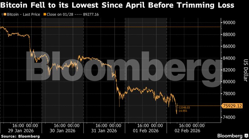 Το μεγαλύτερο κρυπτονόμισμα κατέγραψε απώλειες έως 2,5%, υποχωρώντας στα 74.541 δολάρια, λίγο πάνω από το χαμηλότερο επίπεδο από τότε που ο Ντόναλντ Τραμπ επέστρεψε στον Λευκό Οίκο, πριν έναν χρόνο περίπου. Το χαμηλό αυτό ήταν τα 74.425 δολάρια, στις 7 Απριλίου. Στις 6:30 π.μ. ώρα Λονδίνου, το Bitcoin παρέμενε κάτω από το όριο των 76.000 δολαρίων.