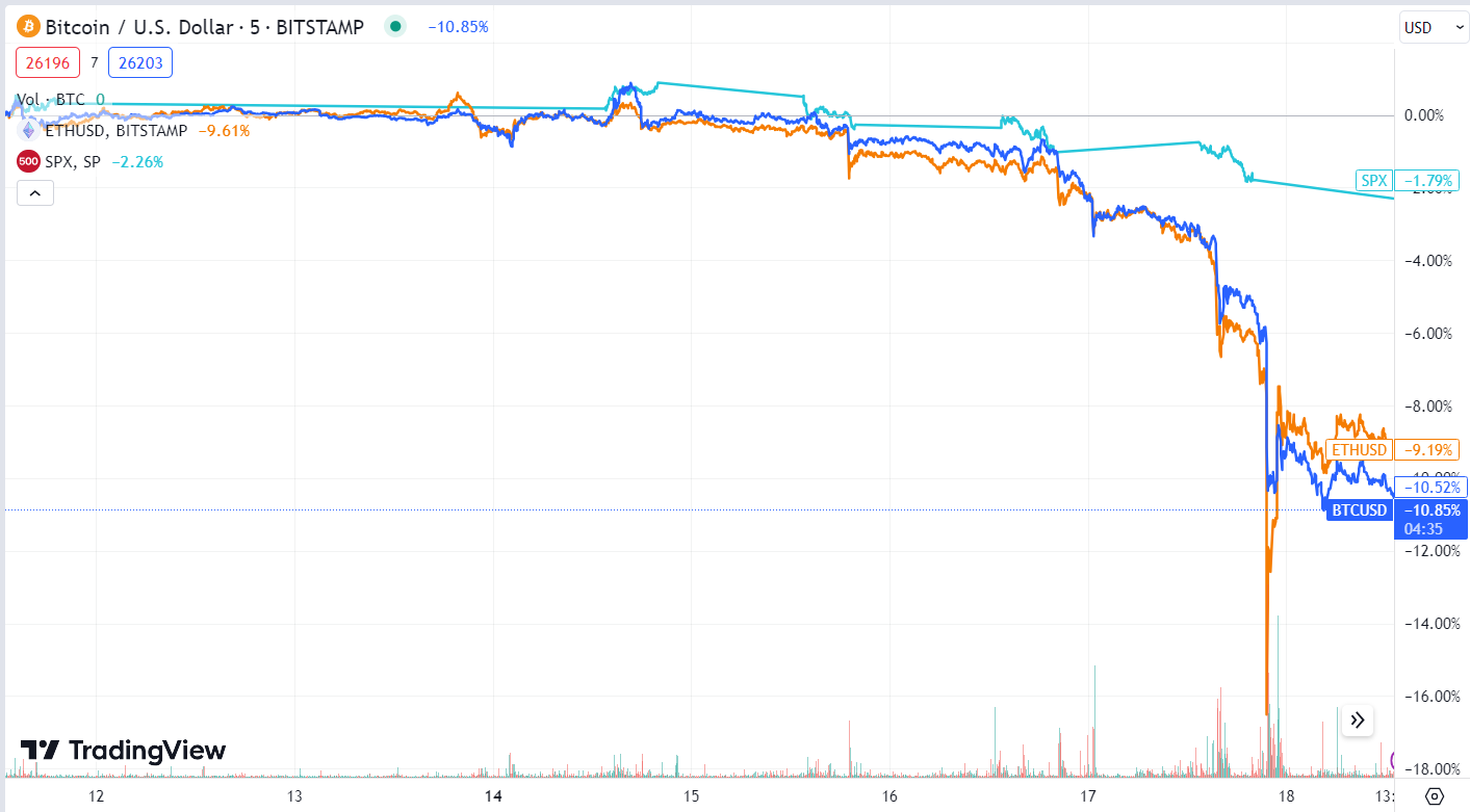Το Bitcoin, το οποίο έκλεισε στις 26.000 δολάρια, έχοντας επανέλθει από χαμηλότερα, δεν δέχθηκε το μεγαλύτερο χτύπημα (από τα σχεδόν 29.000 δολάρια στα 25.314 που ήταν το χαμηλό ημέρας σηματοδοτώντας απώλειες περίπου 10%). Μεγαλύτερες απώλειες κατέγραψε το Litecoin με 13,6% στο 24ωρο και το XRP που έχασε 13% σε μία ημέρα, ενώ συνολικά, η αγορά κρυπτονομισμάτων έπεσε 6,6%, στο ψυχολογικό όριο κεφαλαιοποίησης του 1 τρισεκατομμυρίου δολαρίων. Και η αγορά δεν μπορεί παρά να αναρωτιέται: Τι φταίει και τα cryptos έχασαν υπέρδιπλα σε σχέση με Nasdaq (-2,5%) και S&P500 (1,6%);