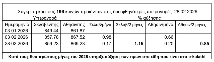 Σε ό,τι αφορά τις τιμές, από τη σύγκριση κόστους 196 κοινών προϊόντων στις δύο φθηνότερες υπεραγορές, προκύπτει ότι κατά τους δύο πρώτους μήνες του 2026 υπήρξε αύξηση των τιμών στα είδη που περιλαμβάνονται στο e-kalathi.