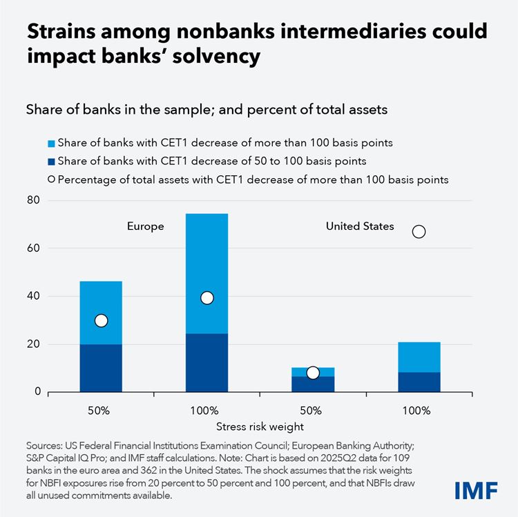 «Η αυξανόμενη έκθεση των τραπεζών στα NBFIs σημαίνει ότι αρνητικές εξελίξεις σε αυτά τα ιδρύματα — όπως υποβαθμίσεις ή πτώση αξιών εγγυήσεων — θα μπορούσαν να επηρεάσουν σημαντικά τους δείκτες κεφαλαιακής επάρκειας των τραπεζών», προειδοποίησε το ΔΝΤ, κάνοντας λόγο για ένα πιθανό αρνητικό ντόμινο.