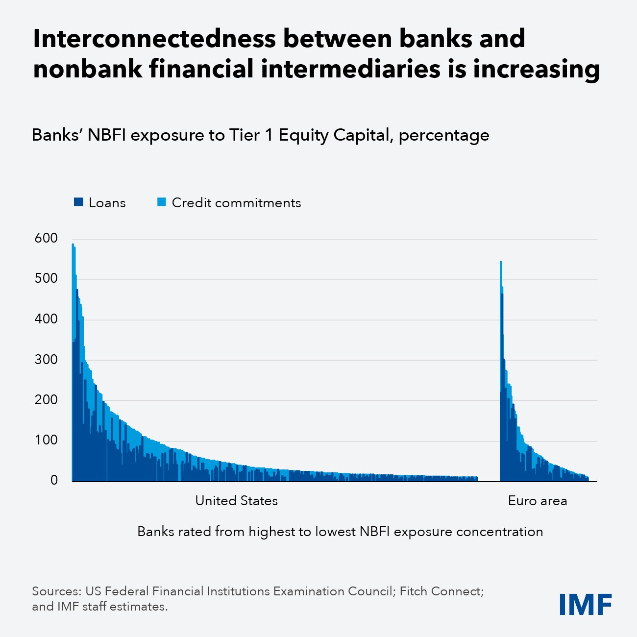 Συνολικά, τα μη τραπεζικά ιδρύματα κατέχουν πλέον περίπου το ήμισυ των παγκόσμιων χρηματοοικονομικών περιουσιακών στοιχείων. Στις Ηνωμένες Πολιτείες και την Ευρωζώνη, πολλές τράπεζες έχουν έκθεση σε μη τραπεζικά ιδρύματα που υπερβαίνει τα ίδια κεφάλαιά τους Tier 1, ένα κρίσιμο «μαξιλάρι» ασφάλειας που επιτρέπει στις τράπεζες να απορροφούν ζημίες και να παραμένουν σταθερές σε περιόδους κρίσης.