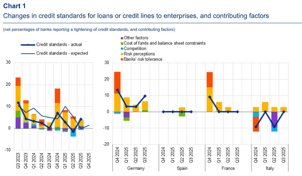 Σύμφωνα με την έρευνα τραπεζικών χορηγήσεων (BLS) της ΕΚΤ για τον Οκτώβριο του 2025, οι τράπεζες της Ευρωζώνης ανέφεραν μικρή καθαρή αυστηροποίηση των πιστωτικών προτύπων – δηλαδή των εσωτερικών κατευθυντήριων γραμμών ή των κριτηρίων έγκρισης δανείων – για τα δάνεια ή τις πιστωτικές γραμμές προς τις επιχειρήσεις το γ’ τρίμηνο του 2025 (καθαρό ποσοστό 4% των τραπεζών).