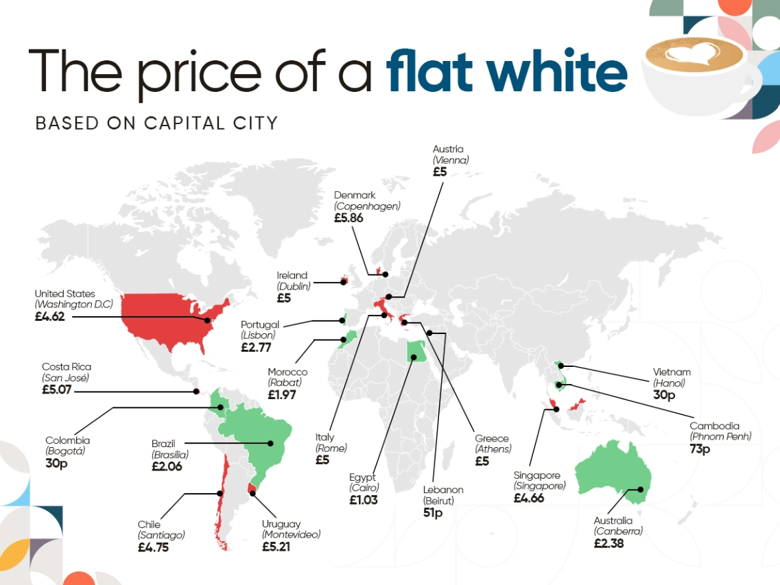 Σύμφωνα με έρευνα που πραγματοποίησε σε 50 πόλεις σε όλο τον κόσμο η UK Debt Expert, συμβουλευτική εταιρεία στο Ηνωμένο Βασίλειο για τη διαχείριση του ιδιωτικού χρέους, η Ελλάδα και συγκεκριμένα η Αθήνα είναι η τέταρτη ακριβότερη πόλη σε έναν καφέ flat white, τον ολοένα και πιο δημοφιλή μεταξύ των νεότερων γενιών καφέ, που είναι κάτι μεταξύ καπουτσίνο και λάτε. Η τιμή του είναι σύμφωνα με την έρευνα 5,86 ευρώ (https://ukdebtexpert.co.uk/blog/the-global-flat-white-index-2024/). Στην πραγματική Δανία (και όχι τη «Δανία του Νότου) και συγκεκριμένα στην Κοπεγχάγη ο εν λόγω καφές κοστίζει 6,86 ευρώ, ενώ δεύτερη ακριβότερη πόλη είναι το Μοντεβιδέο, στην Ουρουγουάη με ένα φλιτζάνι flat white να κοστίζει 6,10 ευρώ. Ακολουθεί στην τρίτη θέση η Ρώμη με τιμή στα ίδια επίπεδα περίπου με αυτά της Αθήνας, ενώ παρόμοιες τιμές συναντούμε στη Βιέννη και στο Δουβλίνο. Πιο φθηνή είναι η Ουάσιγκτον όπου ένα φλιτζάνι καφέ flat white κοστίζει, σύμφωνα πάντα με την έρευνα, 5,41 ευρώ.