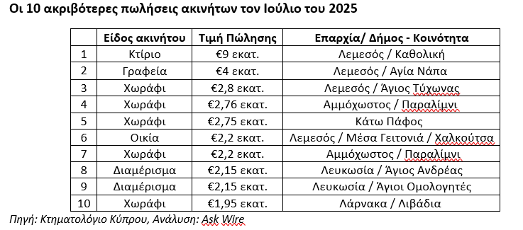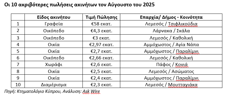 Αυτό αναφέρει η Ask Wire, εταιρεία που βασίζεται στην τεχνολογία για να παρακολουθεί συναλλαγές, ζητούμενες τιμές και την κατασκευαστική δραστηριότητα στον τομέα των ακινήτων και η οποία επεξεργάστηκε και δημοσίευσε στοιχεία για τις ακριβότερες πράξεις πώλησης ακινήτων που ολοκληρώθηκαν τον Ιούλιο και τον Αύγουστο του 2025 και τη συνολική αξία των 10 ακριβότερων πωλήσεων ανά επαρχία.