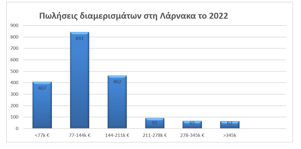 Η συντριπτική πλειοψηφία των διαμερισμάτων (1710) που πωλήθηκαν στην επαρχία Λάρνακας το 2022 δεν υπερέβαιναν σε αξία τις €211.000. Συγκεκριμένα πωλήθηκαν 407 διαμερίσματα αξίας μέχρι €77.000, συνολικά 841 διαμερίσματα αξίας μεταξύ €77.000 - €144.000 και 462 διαμερίσματα αξίας μεταξύ €144.000 - €211.000. Ο αριθμός των διαμερισμάτων που πωλήθηκαν σε τιμές άνω των €211.000 αντιστοιχεί μόλις στο 11,3% του συνόλου. Συγκεκριμένα πωλήθηκαν 91 διαμερίσματα αξίας €211.000 -278.000, άλλα 65 διαμερίσματα αξίας €278.000 - €345.000 και 63 διαμερίσματα αξίας άνω των €345.000.