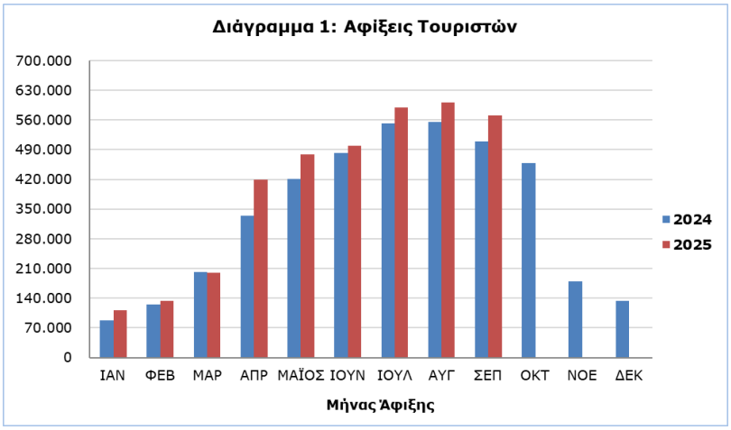 Όπως ανακοίνωσε σήμερα η Στατιστική Υπηρεσία οι αφίξεις τουριστών τον Σεπτέμβριο 2025 ανήλθαν σε 570.635 σε σύγκριση με 509.463 τον Σεπτέμβριο 2024, σημειώνοντας αύξηση 12,0%. Για την περίοδο Ιανουαρίου – Σεπτεμβρίου 2025, οι αφίξεις τουριστών ανήλθαν σε 3.604.790 σε σύγκριση με 3.268.090 την αντίστοιχη περίοδο του 2024, σημειώνοντας αύξηση 10,3%. Υπενθυμίζεται ότι το 2024 καταγράφηκε διπλό ρεκόρ στον κυπριακό τουρισμό με τις αφίξεις να ξεπερνούν για πρώτη φορά τα 4 εκατ. και τα έσοδα από τον τουρισμό τα 3 δισ. ευρώ. Ρεκόρ που όπως όλα δείχνουν αναμένεται να καταρριφθεί φέτος, βάσει της έως τώρα πορείας των αφίξεων, αλλά και των εσόδων.