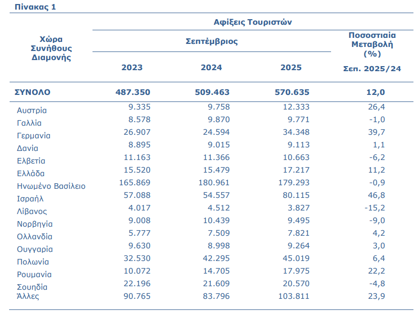 Οι αφίξεις από το Ηνωμένο Βασίλειο υπήρξαν η κυριότερη πηγή τουρισμού για τον Σεπτέμβριο 2025, αφού αποτέλεσαν το 31,4% (179.293) των συνολικών αφίξεων, οι αφίξεις από το Ισραήλ 14,0% (80.115), οι αφίξεις από την Πολωνία το 7,9% (45.019), οι αφίξεις από τη Γερμανία 6,0% (34.348), οι αφίξεις από τη Σουηδία 3,6% (20.570), οι αφίξεις από τη Ρουμανία 3,1% (17.975) και οι αφίξεις από την Ελλάδα 3,0% (17.217).