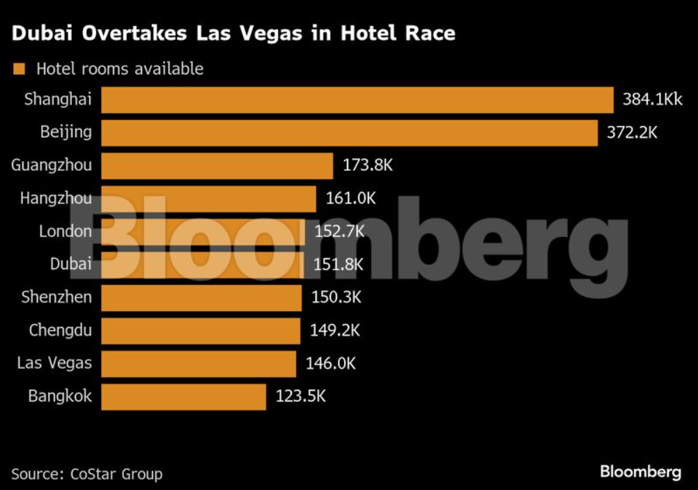«Για πολλά χρόνια, το Ντουμπάι λειτουργούσε κυρίως ως ενδιάμεση στάση για διεθνείς ταξιδιώτες, οι οποίοι περνούσαν από την πόλη χωρίς να διανυκτερεύουν. Τα τελευταία χρόνια, όμως, οι επενδύσεις σε ξενοδοχειακές υποδομές άλλαξαν τα δεδομένα. Ο αριθμός των διαθέσιμων δωματίων έχει διπλασιαστεί μέσα στην τελευταία δεκαετία, και εκτός των κινεζικών πόλεων που επωφελούνται από τον μεγάλο όγκο εσωτερικού τουρισμού, το Ντουμπάι κατατάσσεται σήμερα δεύτερο παγκοσμίως, μετά το Λονδίνο, σε αριθμό ξενοδοχειακών δωματίων.