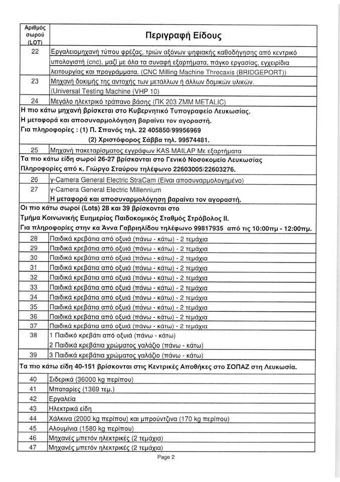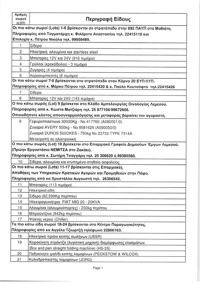 Στη Δημοσιογραφική εστία στη Λευκωσία θα πραγματοποιηθεί στις 17 Μαΐου δημόσιος πλειστηριασμός κατά τον οποίο οι αγοραστές θα μπορούν να αγοράσουν διάφορα αντικείμενα όπως παιδικά κρεβάτια, σίδερα, αλουμίνια, πριόνια, ηλεκτρικά είδη, μηχανές μπετόν και άλλα.