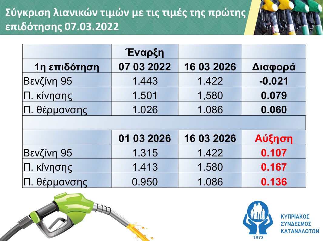 Όπως αναφέρεται, από την 1η Μαρτίου 2026 μέχρι σήμερα η τιμή της βενζίνης 95 αυξήθηκε κατά 10,7 σεντ το λίτρο, το πετρέλαιο κίνησης κατά 16,7 σεντ και το πετρέλαιο θέρμανσης κατά 13,6 σεντ το λίτρο.