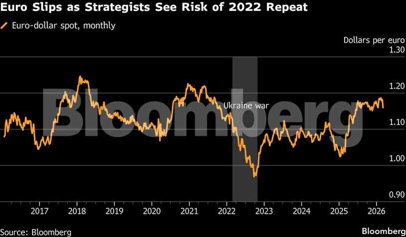 Η αντίδραση στην εισβολή της Ρωσίας στην Ουκρανία το 2022 δείχνει την κλίμακα της ευαισθησίας του ευρώ σε ένα ενεργειακό σοκ, όπως ανέφεραν αναλυτές της Barclays. Με βάση αυτό το προηγούμενο, για κάθε άνοδο 10% στο πετρέλαιο, το δολάριο συνήθως κερδίζει 0,5%-1%, ενώ για μια παρόμοια κίνηση στο φυσικό αέριο, το ευρώ υποχωρεί περίπου 0,25%.