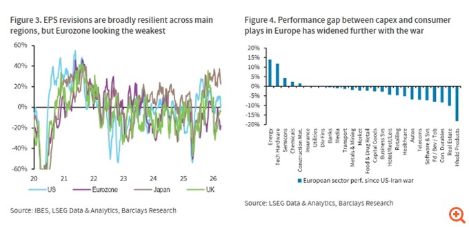 Συνολικά, η Barclays βλέπει τις προσδοκίες για την κερδοφορία του 2026 ως αισιόδοξες στην Ευρώπη και αναμένει ήπιες υποβαθμίσεις, ενώ οι ΗΠΑ πιθανότατα παραμένουν πιο ανθεκτικές.