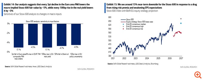 Με βάση τα παραπάνω, η BofA παραμένει αρνητική για τις ευρωπαϊκές μετοχές και τις κυκλικές μετοχές έναντι των αμυντικών: το πρόσφατο ράλι αφήνει τις μετοχές να προεξοφλούν ένα αισιόδοξο μακροοικονομικό αποτέλεσμα. Οι επενδυτές έχουν υποστηρίξει ότι, όπως και στο δασμολογικό σοκ του 2025, ο αντίκτυπος στην ανάπτυξη ενδέχεται να μην υλοποιηθεί - ή, αν συμβεί, οι αγορές ενδέχεται να τον παραβλέψουν. Η BofA ωστόσο διαφωνεί. Πιστεύει ότι ο αντίκτυπος είναι πιθανό να εμφανιστεί - και επίσης ότι, εάν η αγορά, για πρώτη φορά από το 2022, αντιμετωπίσει μια εξασθένηση της παγκόσμιας αναπτυξιακής δυναμικής, πιθανότατα θα επιβάλει μια μετατόπιση υψηλότερα στα ασφάλιστρα κινδύνου από τα τρέχοντα χαμηλά σχεδόν 20 ετών.
