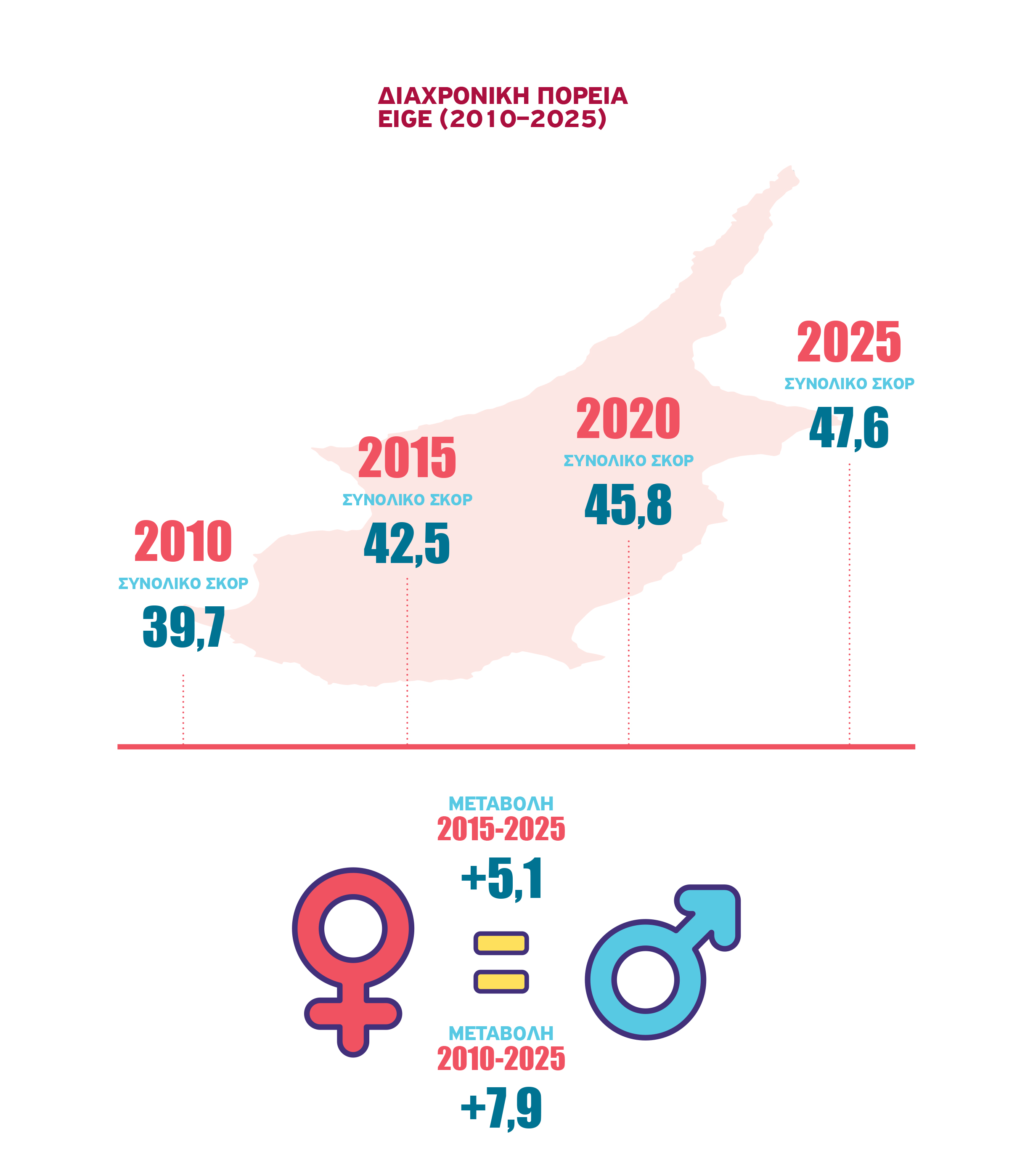 Στον Δείκτη Ισότητας των Φύλων του EIGE, που αποτυπώνει την κατάσταση εντός της Ευρωπαϊκής Ένωσης, η Κύπρος καταγράφει 42,5 μονάδες το 2015 και 47,6 μονάδες το 2025. Η αύξηση των 5,1 μονάδων σε δέκα χρόνια δείχνει βελτίωση. Αν ληφθεί ως αφετηρία το 2010, όταν η χώρα βρισκόταν στις 39,7 μονάδες, η συνολική άνοδος φτάνει τις 7,9 μονάδες. Ο μέσος όρος της Ε.Ε. όμως αυξάνεται από περίπου 56 μονάδες σε 63,4 μονάδες την ίδια περίοδο. Η Κύπρος παραμένει στις τελευταίες θέσεις της Ε.Ε., παρά τη μεταβολή προς τα πάνω.