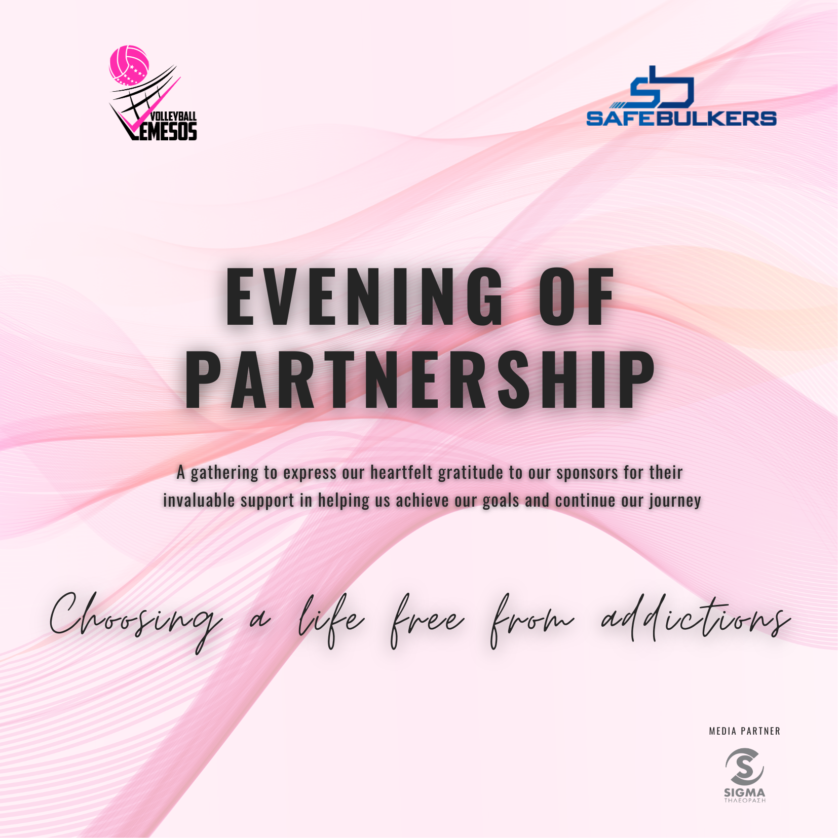 Η Lemesos Volleyball, σε συνεργασία με την εταιρεία Safe Bulkers, διοργανώνει την εκδήλωση «Βραδιά Συνεργασίας» την Δευτέρα, 4 Νοεμβρίου 2024, στις 17:30, στο Safe Bulkers Tower. Η εκδήλωση αυτή έχει στόχο να εκφράσει την ειλικρινή μας ευγνωμοσύνη προς τους χορηγούς και υποστηρικτές μας, των οποίων η ανεκτίμητη συμβολή μάς βοηθά να εκπληρώνουμε τους στόχους μας και να συνεχίζουμε το όραμά μας για την ανάπτυξη του αθλητισμού.