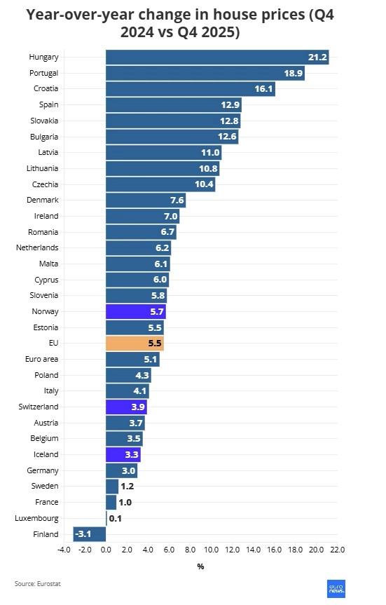 Η Ουγγαρία κατέγραψε τη μεγαλύτερη ετήσια αύξηση τιμών κατοικιών στο τέταρτο τρίμηνο του 2025, με άνοδο 21,2%, σύμφωνα με τα στοιχεία της Eurostat.