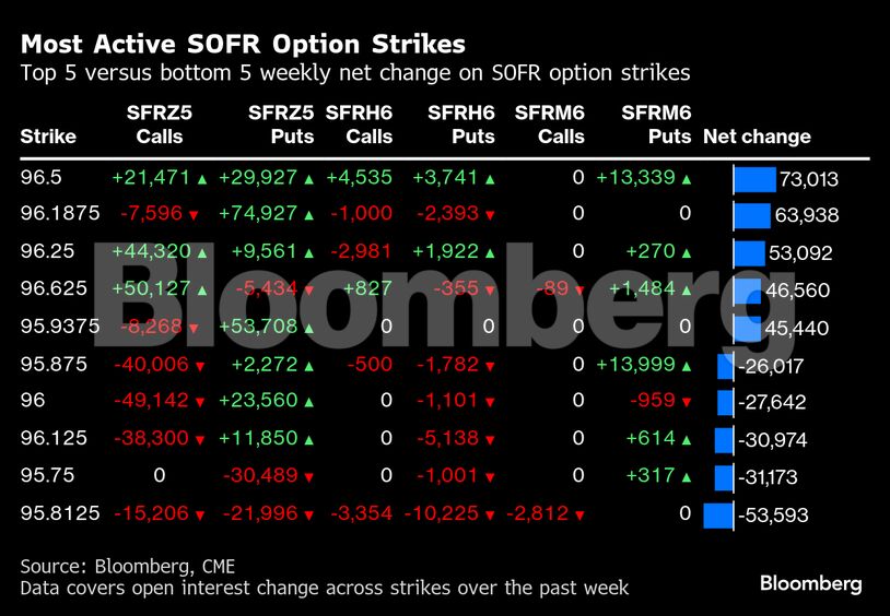 Στις επιλογές SOFR για τις περιόδους 25 Δεκεμβρίου, 26 Μαρτίου και 26 Ιουνίου, υπήρξε ένας μεγάλος αριθμός νέων θέσεων που επικεντρώθηκαν γύρω από τις τιμές εξάσκησης 96,50 λόγω της δραστηριότητας στις επιλογές αγοράς και πώλησης για τις 25 Δεκεμβρίου, καθώς και στις επιλογές πώλησης για τις 26 Ιουνίου. Η τιμή εξάσκησης ήταν το επίκεντρο πολλαπλών συναλλαγών call condor στις επιλογές για τις 25 Δεκεμβρίου, οι οποίες φαίνεται να στοχεύουν σε μειώσεις επιτοκίων 25 μονάδων βάσης σε καθεμία από τις τρεις εναπομένουσες συνεδριάσεις της Fed φέτος. Υπήρξε επίσης σημαντική αγορά στο put SFRZ5 96,50/96,375/96,25, μαζί με το spreads call SFRZ5 96,50/96,625.