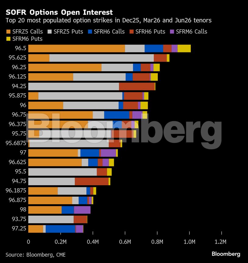 Στα δικαιώματα προαίρεσης SOFR με διάρκεια 25 Δεκεμβρίου, 26 Μαρτίου και 26 Ιουνίου, η τιμή εξάσκησης 96,50 είναι η πιο δημοφιλής και έχει σημειώσει έντονη δραστηριότητα την τελευταία εβδομάδα. Το μεγαλύτερο μέρος της τιμής εξάσκησης συγκεντρώνεται στα calls της 25ης Δεκεμβρίου, σε θέσεις που φαίνεται να στοχεύουν σε μείωση των επιτοκίων κατά 50 μονάδες βάσης σε μία από τις εναπομένουσες συνεδριάσεις της Fed φέτος. Η τιμή εξάσκησης 95,625 είναι επίσης πολύ δημοφιλής, λόγω του μεγάλου ανοιχτού ενδιαφέροντος για puts του Δεκεμβρίου 2025.