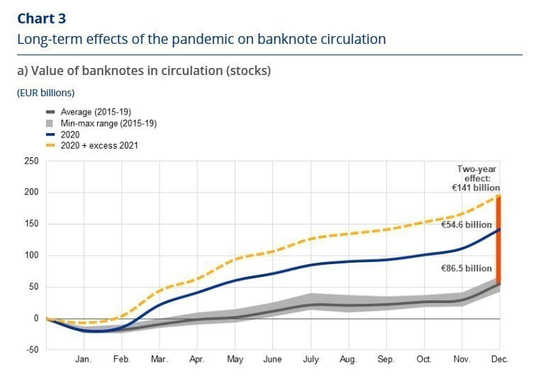 Αντιστοίχως, κατά τη διάρκεια της πανδημίας, τα μετρητά στα χέρια των πολιτών αυξήθηκαν κατά 140 δισ. ευρώ μέσα σε δύο χρόνια, έναντι ετήσιας αύξησης 55 δισ. ευρώ προ κρίσης, σύμφωνα με την ΕΚΤ. Η αύξηση αυτή καταγράφηκε ακόμη και όταν οι καταναλωτές στράφηκαν σε ανέπαφες κάρτες και διαδικτυακές αγορές, λόγω υγειονομικών ανησυχιών και περιοριστικών μέτρων.