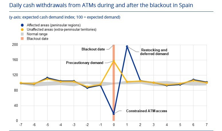 Στην περίπτωση της εκτεταμένης διακοπής ηλεκτροδότησης στην Ιβηρική τον Απρίλιο, όταν κατέρρευσαν οι υπηρεσίες ρεύματος και τηλεπικοινωνιών, τα τερματικά καρτών, το online banking και τα ΑΤΜ ήταν εκτός λειτουργίας. Για όσους είχαν μετρητά, αυτά αποδείχθηκαν πολύ συχνά το μοναδικό μέσο πληρωμής. Μόλις αποκαταστάθηκαν οι υπηρεσίες, καταγράφηκε κύμα αναλήψεων, καθώς οι πολίτες αναπλήρωναν τα αποθέματά τους.