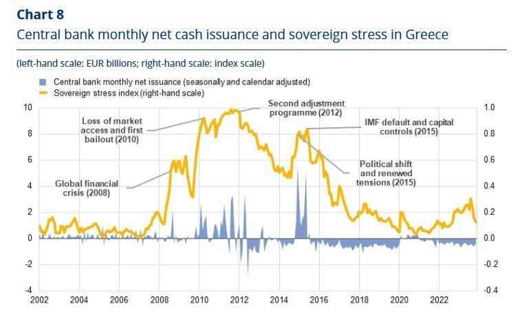 Μια τέτοια περίπτωση ήταν βέβαια η κρίση χρέους στην Ελλάδα, η αυξημένη αβεβαιότητα στις αγορές, που προκλήθηκε από τις πολιτικές εξελίξεις και τις μεταβαλλόμενες προοπτικές του προγράμματος μακροοικονομικής προσαρμογής, οδήγησε σε απότομη αύξηση της ζήτησης για τραπεζογραμμάτια στην Ελλάδα.